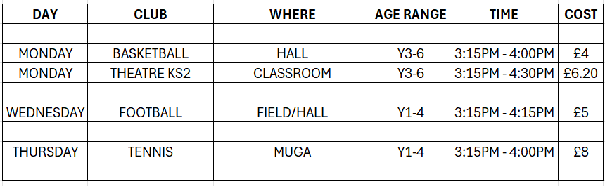 We offer a variety of afterschool clubs for all ages and experiences. For more information, please contact the School Office.